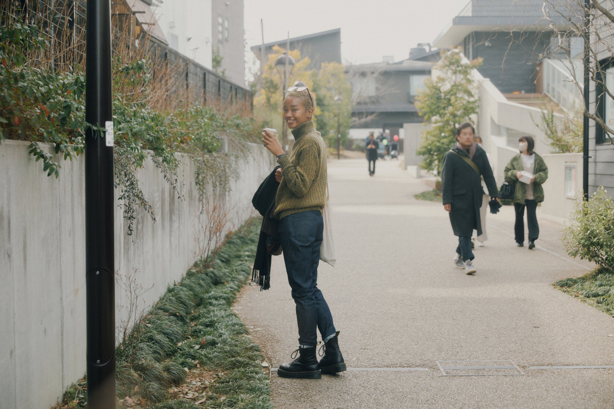 約束の時間に駅前へ向かうと、広場で腰をかけて読書を勤しむサリス レイヤさんを見つけた。NC PRODUCTSのデニムパンツにドクターマーチンの定番である8ホールブーツ、レザージャケットという佇まいの彼女は、日本とガーナをルーツにもつ。