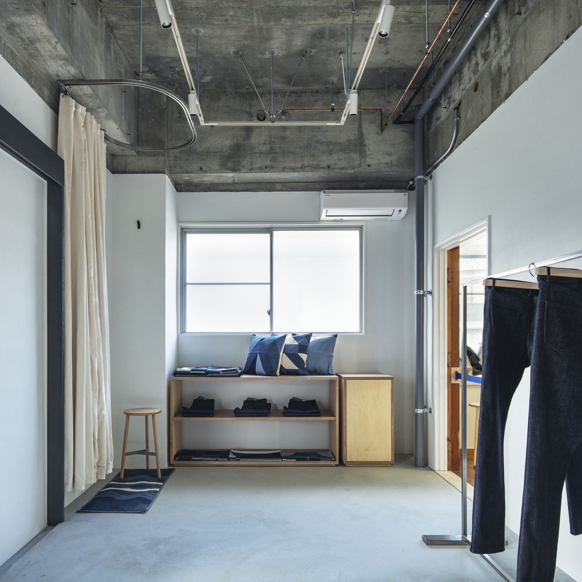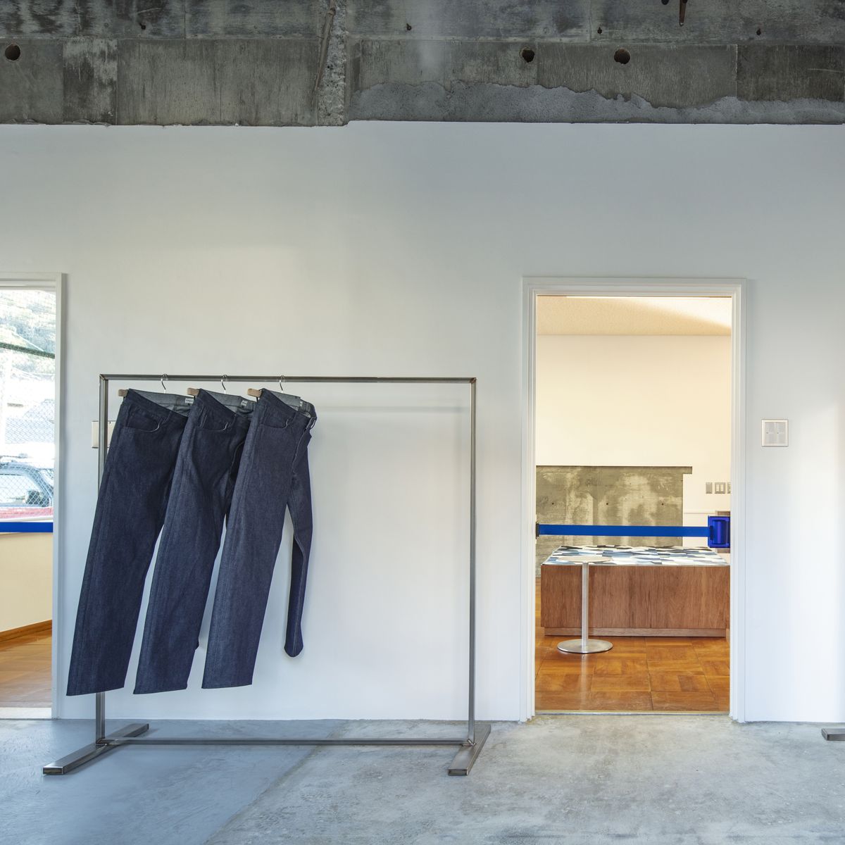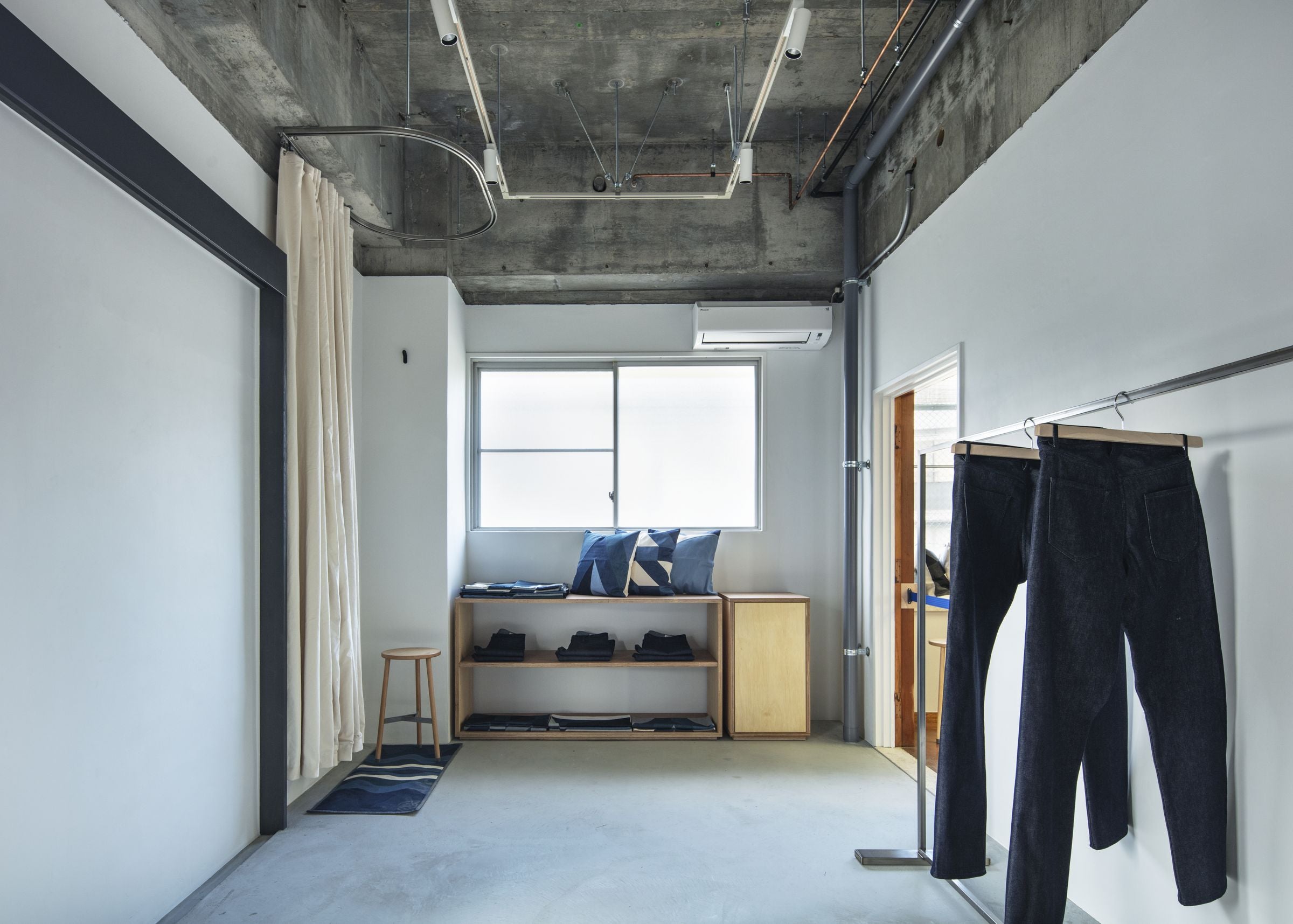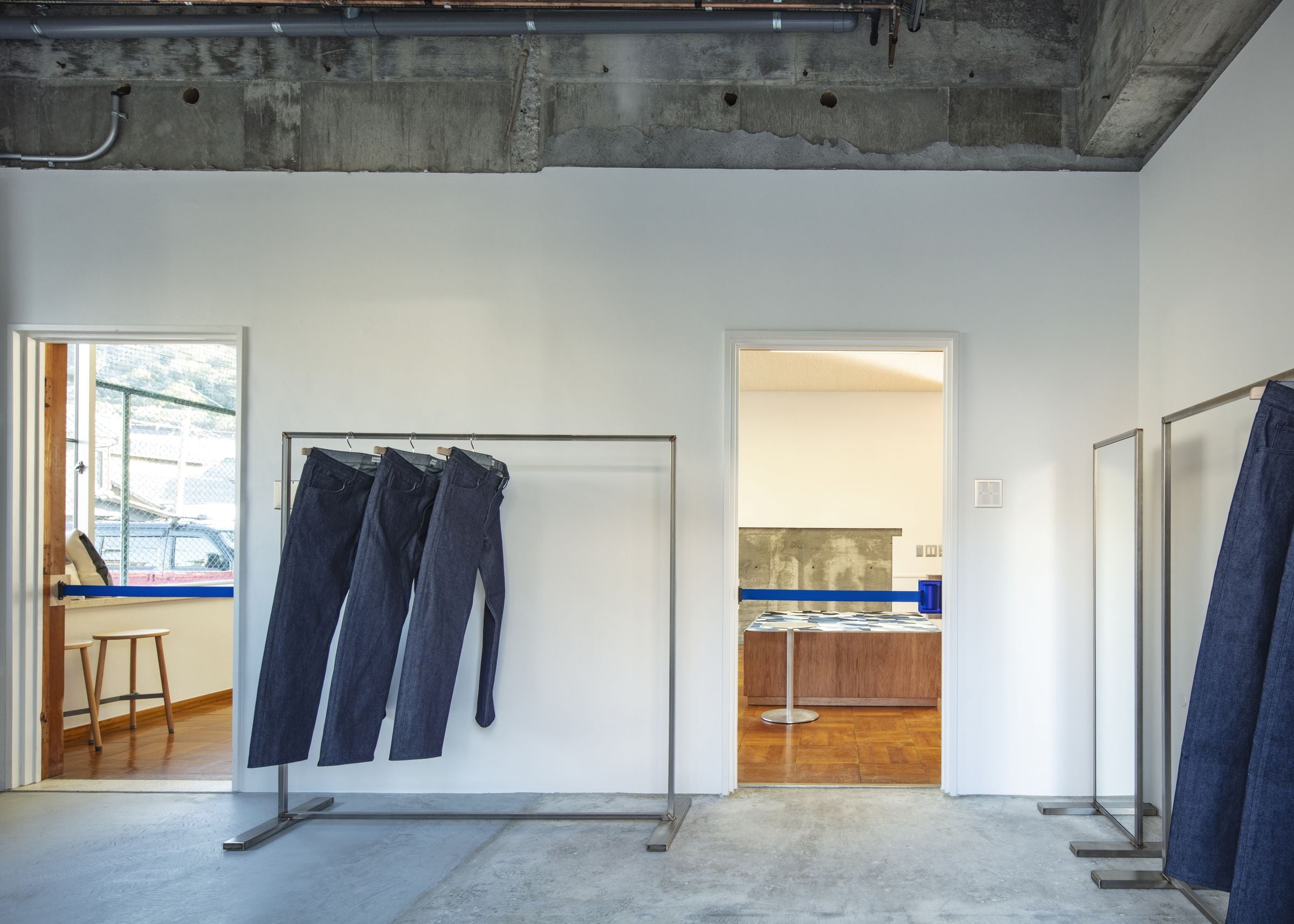 工場に併設された店舗として、ものづくりの現場により近い場所で、デニム製品をはじめとするアイテムを実際に手に取り、素材感やシルエット、縫製のディテールまでじっくりご覧いただけます。